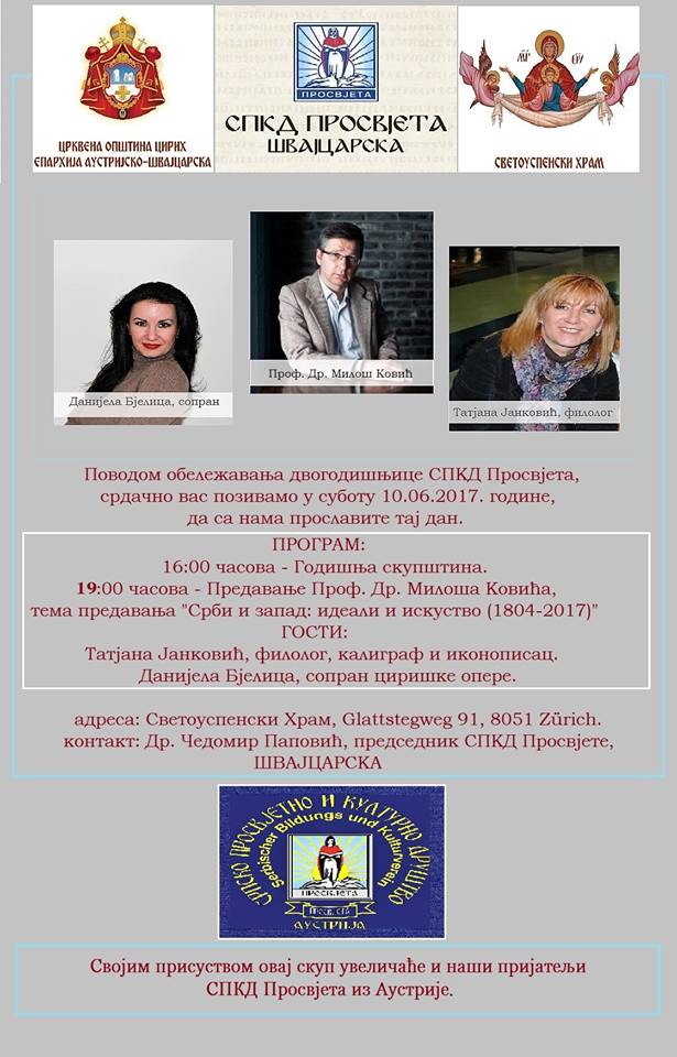 Двогодишњица просвјете у Швајцарској!   Почетак 4:00 PM 10 јуна, 2017   Крај 10:00 PM 10 јуна, 2017   Адреса Светоуспенски храм, Глаттштегвег 91, Цирих, Швајцарска   Цена карте CHF- (NOR) CHF- (VIP) Мапа Повезане новости